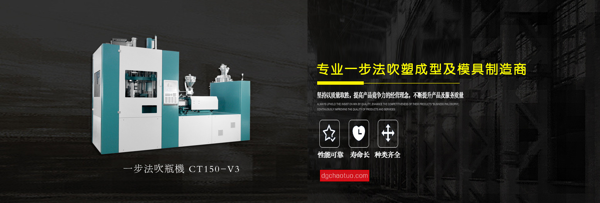 東莞超拓機械有限公司是一家專業設計生產一步法注吹機及相關配套模具的制造企業, 公司自成立至今,始終以市場為導向、科技為基礎、質量第一、用戶至上為服務宗旨,并一直在跟進和學習世界上先進的“注拉吹”中空成型技術專業領域配件制造和檢驗技術,不斷地創新求異,其中PPSU奶瓶領先國內同行業,堅持“超越拓展,品質保證”的企業文化理念,為客戶提供上乘服務。公司總經理姜業東攜全體員工衷心感謝新老客戶的支持和關愛,竭誠歡迎各位朋友蒞臨指導與合作,共圖發展。